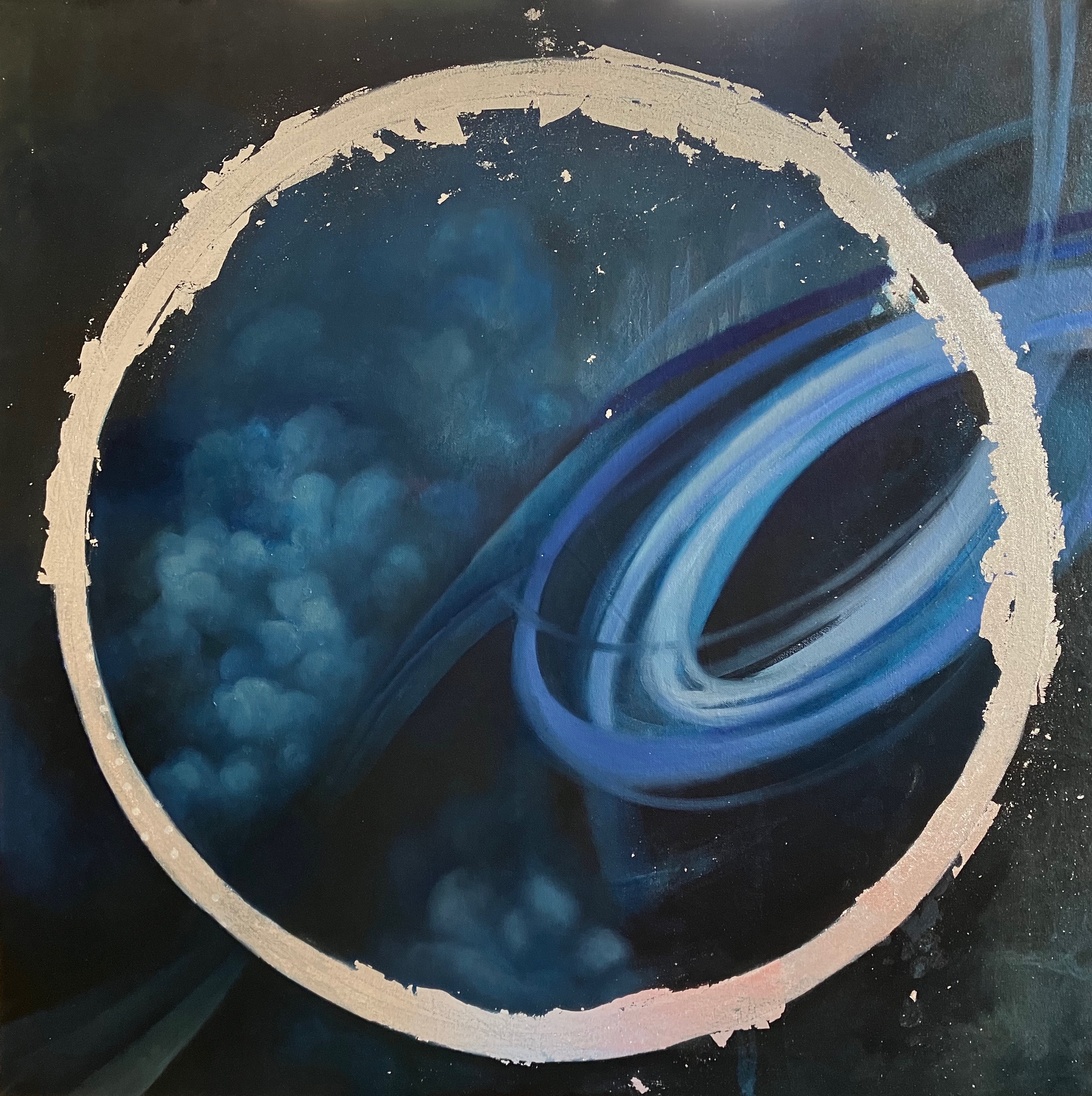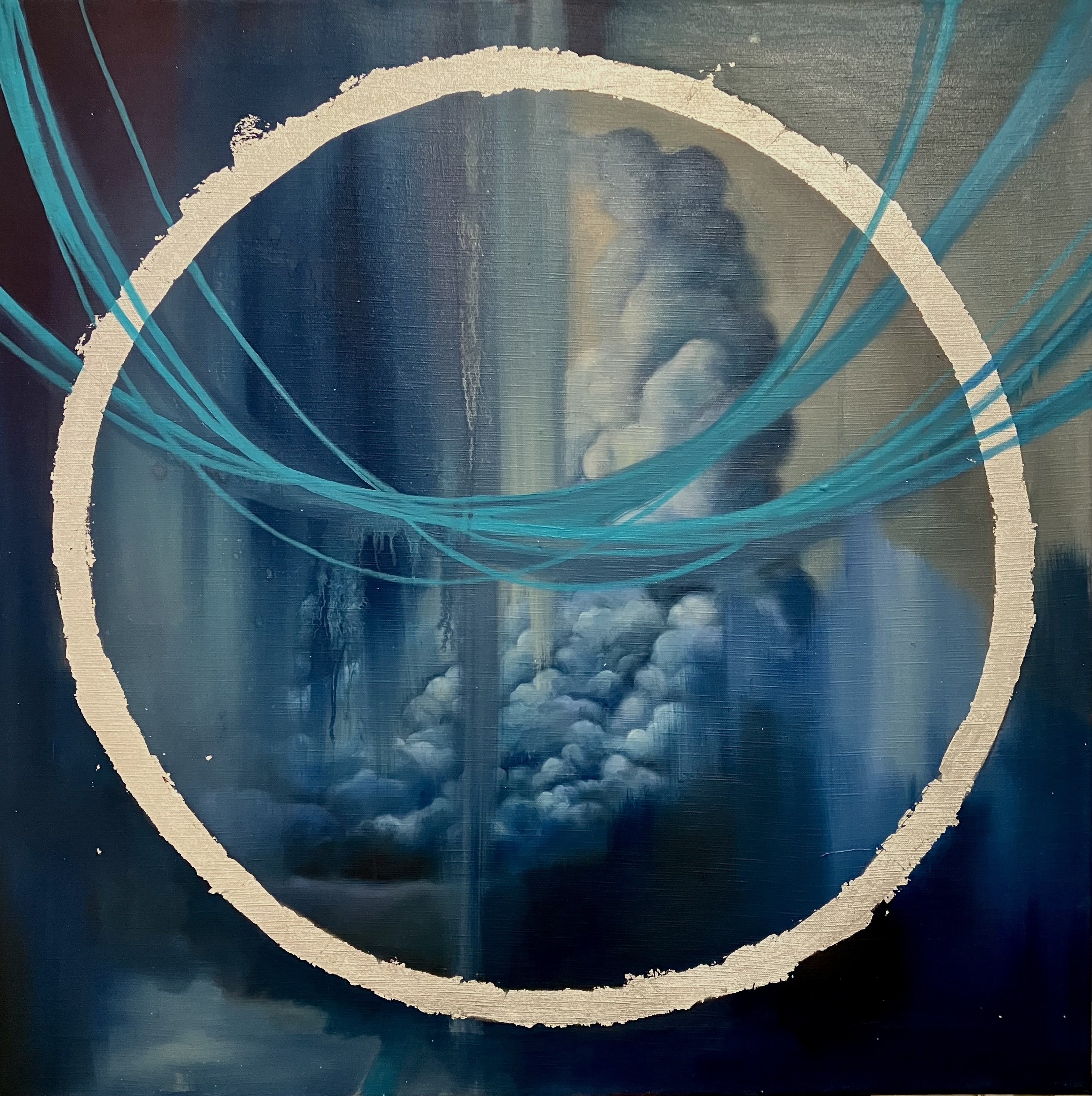 In the watercourse way Oil and silver leave on canvas, 84×84 cmOlio e foglia d’argento su tela, 84×84 cm